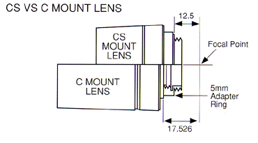 Cameras with C or CS mountModern cameras and lenses are generally CS mount rather than C mount. With CS mount cameras both types of lenses can be used but the C mount lens requires a 5mm ring to be fitted between the camera and lens to achieve a focused image. With C mount cameras it is not possible to use CS mount lenses as it is not physically possible to mount the lens close enough to the CCD to achieve a focused image.