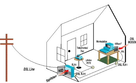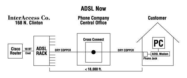 The above diagram describes how in the future the ADSL rack will be located in the phone co. central office. This will enable you to be online and also be able to use your phone at the same time
